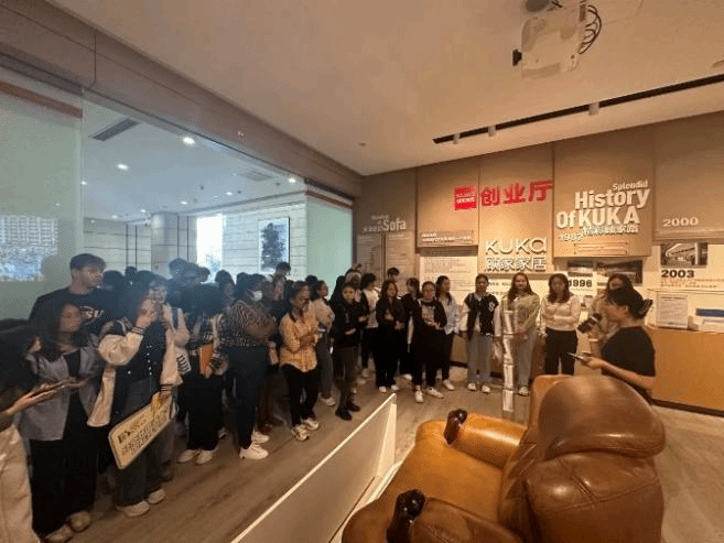 在2023秋季学期来华留学生企业参访实践周期间,北京外国语大学(北外)国际商学院的留学生们与来自浙江工商大学的留学生共同参观了顾家家居的全球总部。这次活动旨在让来自不同国家的同学们更深入地了解中国家具制造业的魅力和实力,同时也为两校的留学生们提供了一次难得的交流机会。