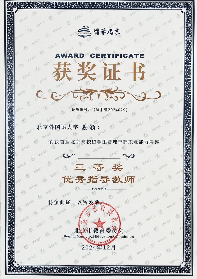 本次展评共分来华留学生教师和管理干部两个赛道,来自清华大学、中国人民大学、北京师范大学、北京理工大学、北京外国语大学等40所在京高校、108位教师报名参与,20余所高校的各领域专家担任评委。经过激烈角逐,我校国际商学院来华留学生管理教师林敏凭借出色表现荣获留学生管理干部职业能力展评三等奖,留学生办公室副主任姜颖获优秀指导教师奖,展示出我校来华留学工作较高的管理水平与专业能力。